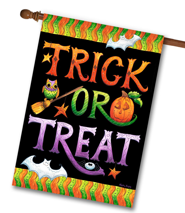 Designed exclusively for you by Karen Embry, our Halloween Trick or Treat – House Flag will brighten your home. This product is a generous – 28″ x 40″ and is made of the highest quality materials. We print each design with care! If you are looking to celebrate Halloween, this will be sure to get you into the spirit and personalize your home or campsite. Searching for a gift for your Mom, Grandmother or Sister? Need a gift for your Best Friend who has everything? Need something unique for Dad? You will be thrilled with the reaction when they open a House Flag as a gift from you!
