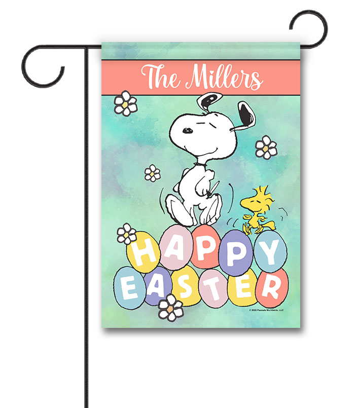 Flagology’s Personalized PEANUTS® Happy Easter Eggs Snoopy Garden Flag will add character to your yard or garden. This product is a generous – 12.5″ x 18″ and is made of the highest quality materials. We print each design with care! If you are looking to celebrate Easter, this will be sure to get you into the spirit and personalize your home or campsite. Featured as part of our growing PEANUTS® collection, this Garden Flag from the original cartoon art of Charles Schulz features All Peanuts, Snoopy and Woodstock. Searching for a gift for your Mom, Grandmother or Sister? Need a gift for your Best Friend who has everything? Need something unique for Dad? You will be thrilled with the reaction when they open a Garden Flag as a gift from you!